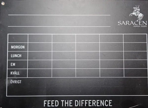 Boxskylt för hästens foderstat. Medföljande specialpenna kan användas och texten kan enkelt suddas ut när den behöver ändras!